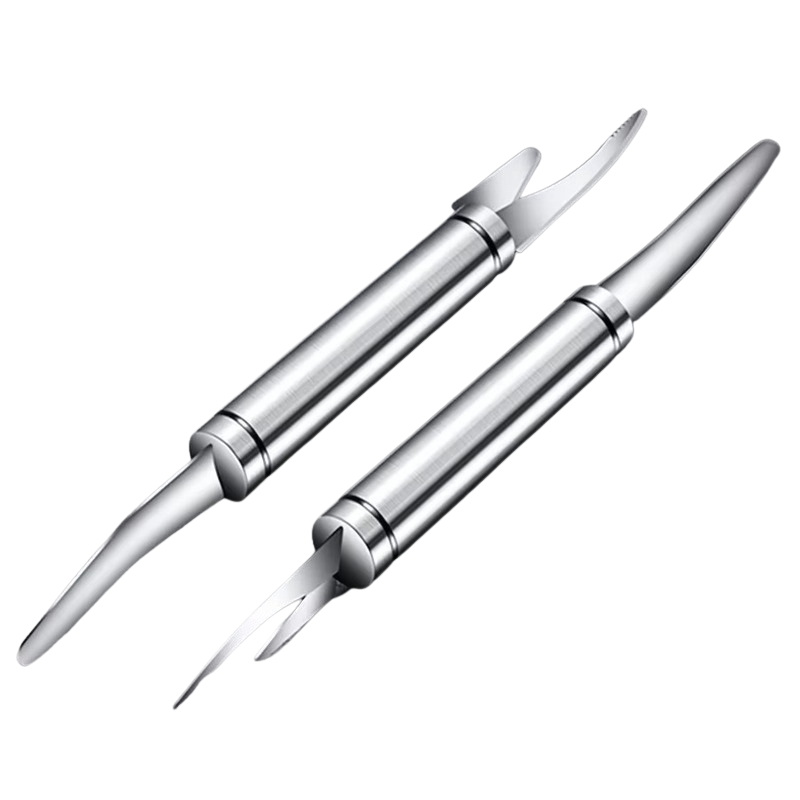 Za lupljenje in rezanje: Dvojna rezila učinkovito očistijo luske, koničasti robovi pa natančno režejo.